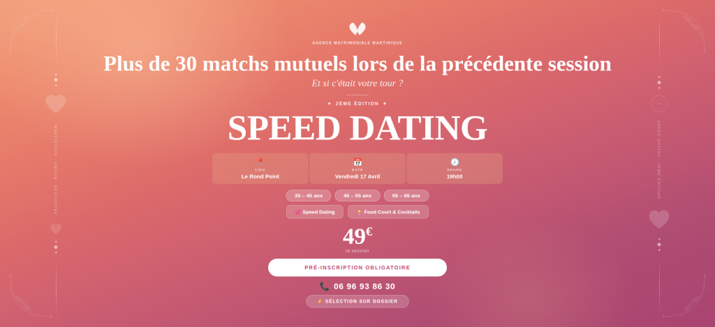 Si vous êtes invité à notre prochaine session de speed dating, sachez que cela signifie que nous avons identifié un haut potentiel de compatibilité entre vous et les autres participants. Nous nous engageons à créer des espaces où les cœurs s’alignent, où les rencontres sont significatives et où l’amour véritable a toutes les chances de fleurir.